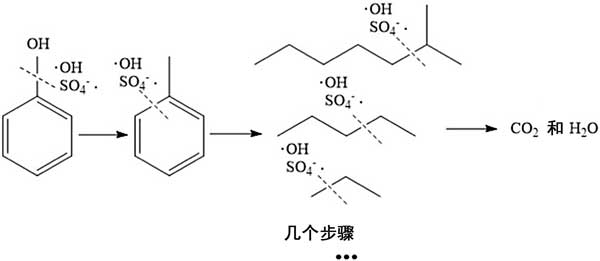 圖4顯示了苯酚的降解過程。首先破壞連接苯酚中羥基的化學鍵,然后打開苯環(huán)以形成通過單鍵連接的單鏈。隨著反應的進行,單鏈之間的化學鍵被破壞,并形成具有較少碳原子數的單鏈。將鏈重組為新的長鏈的過程是由于氧化劑劑量不足。然而,隨著反應的進行,諸如這些短鏈和新形成的長鏈的中間體被進一步降解。在此過程中,一些單鏈會隨著反應時間的增加而重組形成一條更長的新單鏈。隨著這一過程的繼續(xù),長單鏈逐漸分解成短鏈,然后苯酚礦化成二氧化碳和水。