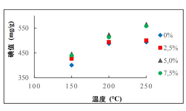 從圖1可以看出,熱解溫度具有增加活性炭和木炭的碘值的作用,因?yàn)樗黾恿藷峤夥磻?yīng)器中的壓力,從而促進(jìn)了碳鏈的斷開(kāi)。這也導(dǎo)致了轉(zhuǎn)移碳的數(shù)量增加。會(huì)在熱解過(guò)程中誘發(fā)碳?xì)浠衔锖推渌袡C(jī)化合物的分解。此外,它增加了木炭和活性炭孔的表面積。