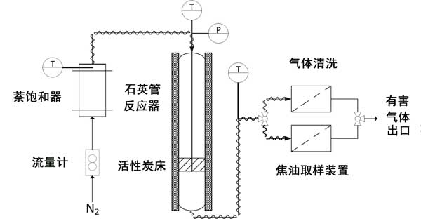 萘轉(zhuǎn)化試驗已在圖1所示的實驗設(shè)備中進(jìn)行,該設(shè)備顯示了其主要部分:進(jìn)料系統(tǒng),反應(yīng)器,采樣/清潔裝置和氣體分析儀。進(jìn)料系統(tǒng)由用于調(diào)節(jié)氮?dú)饬髁康霓D(zhuǎn)子流量計和萘飽和器組成,以獲取摻有焦油的物流。飽和器和反應(yīng)器之間的管道應(yīng)保持在150°C以上,以免萘發(fā)生冷凝。所使用的反應(yīng)器是內(nèi)徑為14 mm,總高度為600 mm的立式管狀石英反應(yīng)器。將活性炭床放在反應(yīng)器內(nèi)部的玻璃粉上方,該玻璃粉位于距頂部430毫米處。床的溫度通過K型熱電偶在床的中央進(jìn)行測定。在焦油采樣期間,通過切換三通閥,將反應(yīng)器出口處的氣體導(dǎo)入采樣裝置,并在其余時間內(nèi)導(dǎo)入清潔裝置。采樣裝置由三個撞擊器組成,在0°C時充滿異丙醇。專用實驗表明,在本研究分析的條件下,該設(shè)備的捕獲效率超過99%。借助帶有熱導(dǎo)檢測器(TCD)的微型氣相色譜儀分析清潔區(qū)出口處的氣體,以在線測定短鏈烴(從乙炔到苯)和分子氫。實驗裝置的更多詳細(xì)信息可以在其他地方找到。