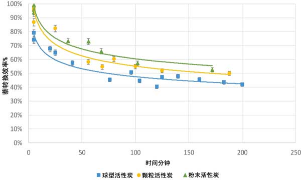 圖3:在750°C時,活性炭球型、顆粒和粉末的萘轉(zhuǎn)化時間。