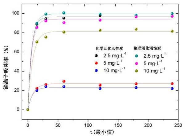 吸附實(shí)驗(yàn)表明,溶液pH的變化對活性炭的吸附有很大影響,在pH為4時(shí)獲得較大的吸附。如預(yù)期的那樣,溶液鏑濃度的降低會(huì)增加吸附百分比。另外,在化學(xué)活性炭的情況下,鏑吸收量隨著吸附劑量的增加而逐漸增加。在物理活性炭的情況下,沒有觀察到這種效果,其中除了使用的最低量外,吸附百分比實(shí)際上保持恒定。最后,溫度的變化稍微改善了吸附過程。盡管如此,物理活性炭在所有情況下都表現(xiàn)出很強(qiáng)的吸附能力。