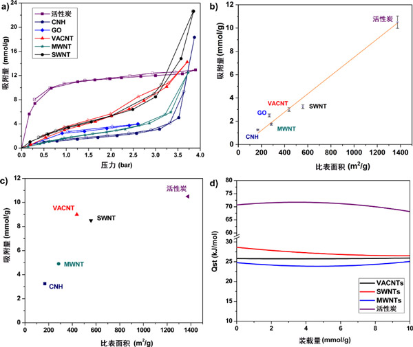 圖1顯示了不同吸附劑的示意圖。活性炭具有無序的孔結構(圖1a),其孔隙度是由基本結構單元的無規(guī)堆積引起的,該結構單元可能是小于10-20環(huán)的平面芳族結構,分布在2-4層上或有缺陷的微石墨烯層。具有這種形態(tài),它代表具有擴展的結構紊亂的類型學碳吸附劑。氧化石墨烯具有2D分層結構,如圖1b所示。合成氧化石墨烯的起始材料是石墨,石墨的氧化引入了氧官能團,繼而增加了層間距并使材料變成親水性。隨后的剝落步驟將各層分開,從而顯著增加其可訪問的表面積,從而導致單層或少層氧化石墨烯的形成。在我們以前的工作中,通過XPS分析,我們發(fā)現氧化石墨烯上存在的氧官能團是羥基和羧基的形式。材料在孔隙率和功能化程度方面的可調性使氧化石墨烯成為親水性碳吸附劑的原型,因此對于研究2D材料中的氣體吸附也很有趣。碳納米角具有管狀結構,在一端具有封閉的錐形尖端結構(圖1c)。單個碳納米角通常為單壁,內徑為2-4 nm。碳納米角的獨特特征是直徑為50–100 nm的剛性球形聚集結構。合成后的碳納米角關閉,氣體分子無法進入碳納米角內部。氧化處理,例如在空氣中加熱,O 2 或CO 2用于打開碳納米角,從而將可及表面積增加3-4倍。碳納米角具有微孔的組合,對于氣體吸附應用很有趣,因為它們可以大量生產且純度高。