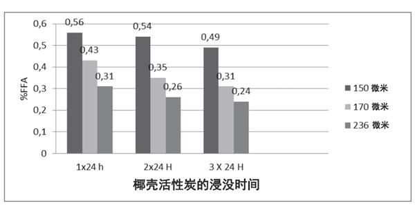 可以得出結(jié)論,使用活性炭長時(shí)間的浸泡和小的顆粒尺寸效果比較好。另外,浸漬時(shí)間,粒度和活性炭吸附劑類型對減少食用油的游離脂肪酸數(shù)量有影響。
