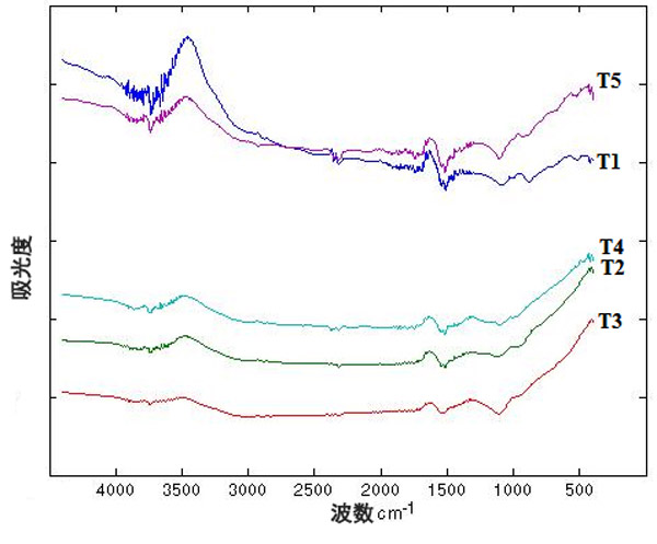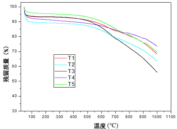 根據(jù)圖3,不同的處理導(dǎo)致熱分解曲線有所不同。此外,不同處理的殘留質(zhì)量也有所不同,處理T1,T4和T5呈現(xiàn)更高的殘留質(zhì)量,表明這些處理具有更高的耐熱性。處理T2和T3的殘留量較低,表明處理的耐熱性較低。此外,這些處理在后期殘留質(zhì)量之間存在重大差異而脫穎而出。根據(jù)處理(電擊時間),降解曲線的差異可能與表面上不同官能團的存在有關(guān)。在熱過程中,由于存在的官能團,會形成不同的產(chǎn)物,從而導(dǎo)致更高或更低的質(zhì)量損失,因為活性炭的熱分解反應(yīng)了其表面上官能團的存在。然后,官能團的類型和數(shù)量都會影響熱重曲線。但是,由于表面官能團的降解與其結(jié)構(gòu)不同,因此官能團的類型具有更大的影響,并且可以解釋處理之間的差異。