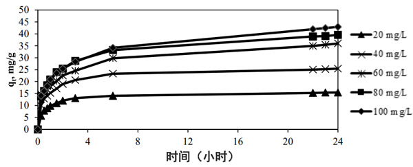 圖2說明了甲基黃初始濃度和接觸時(shí)間對30°C時(shí)吸附平衡的影響。隨著初始染料濃度從20 mg/L增加到100 mg/L,發(fā)現(xiàn)平衡時(shí)的染料吸附量增加。這些表明初始濃度提供了必要的驅(qū)動力,以克服對染料分子在水相和固相之間傳質(zhì)的阻力。初始濃度越高,濃度梯度的驅(qū)動力越大。從圖中可以看出,較高的初始濃度的染料溶液需要更長的接觸時(shí)間才能達(dá)到平衡。初始濃度為20-40 mg/L的染料溶液達(dá)到平衡所需的接觸時(shí)間約為3-5小時(shí)。