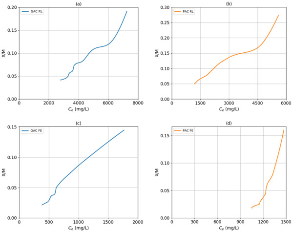 圖1顯示了顆;钚蕴颗c原浸出液,粉狀活性炭與原浸出液,粉狀活性炭與廢液以及粉狀活性炭與廢液的實驗等溫線。兩個樣品的曲線和兩個活性炭對應(yīng)于S形的等溫線(II型)的行為,因為曲線是凹向上,所以多層吸附進行活性炭的表面上。利用該信息,就滲濾液而言,不管活性炭顆粒的性質(zhì)和大小如何,都可以假定吸附劑中殘留的化學(xué)需氧量是通過物理吸附發(fā)生的。