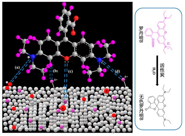 羅丹明B降解機(jī)理示意圖;钚蕴康谋砻嫔洗嬖趲讉(gè)官能團(tuán),它們可以與羅丹明B染料分子相互作用?赡艿南嗷プ饔煤(jiǎn)述如下:(a)活性炭的–COOH基團(tuán)與羅丹明B的負(fù)電性基團(tuán)之間的相互作用,(b)活性炭的–OH基團(tuán)與羅丹明B的芳環(huán)之間的氫鍵,(c)氫鍵活性炭的–OH基團(tuán)與羅丹明B的x噸基團(tuán)之間存在(d)活性炭和羅丹明B染料分子的表面官能團(tuán)之間的靜電相互作用。