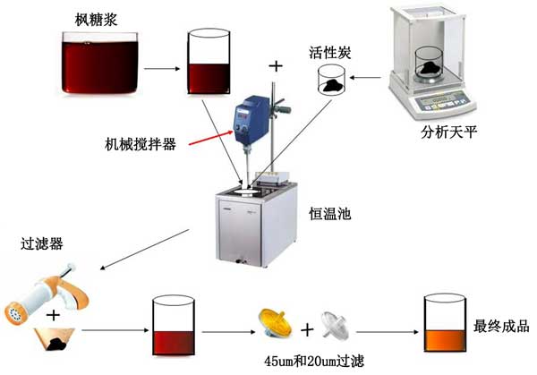 根據(jù)實(shí)驗(yàn)測試活性炭使黑楓糖漿變色的機(jī)制,使用食品級活性炭作為吸附材料,以改善深色楓糖漿的顏色和氣味/味道,從而生產(chǎn)與淡糖漿或琥珀色糖漿。圖1說明了該測試中使用的變色過程。為了進(jìn)行實(shí)驗(yàn),我們使用了不同量的活性炭(0.01、0.03和0.05 g),并引入10 mL楓糖漿樣品中,以得到0.1、0.3和0.5g/100 mL的最終濃度。然后,將混合物放入恒溫池中,以便通過使用電動攪拌裝置來調(diào)節(jié)工作溫度和攪拌速度。攪拌(混合)時間設(shè)置為20、40和60分鐘。在混合時間結(jié)束時,首先通過使用簡單的紙過濾器過濾混合物,以去除使用過的活性炭的大顆粒。通過使用兩個分別具有45和20μm的篩孔尺寸的注射器過濾器進(jìn)行第二次過濾。