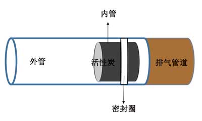 模擬的測(cè)試環(huán)境包含內(nèi)部和外部兩部分的試管進(jìn)行吸附。外管的長度為50cm,直徑為3.8cm。該管的功能是將排氣消聲器連接至氣體分析儀,而內(nèi)管則用作活性炭的儲(chǔ)存器。改變內(nèi)管的長度,以確定活性炭負(fù)載百分比對(duì)降低廢氣濃度的影響。直徑分別為3cm,4cm和5cm。管子之間有一個(gè)密封,以防止廢氣泄漏。管的結(jié)構(gòu)在圖1中進(jìn)行了描述。