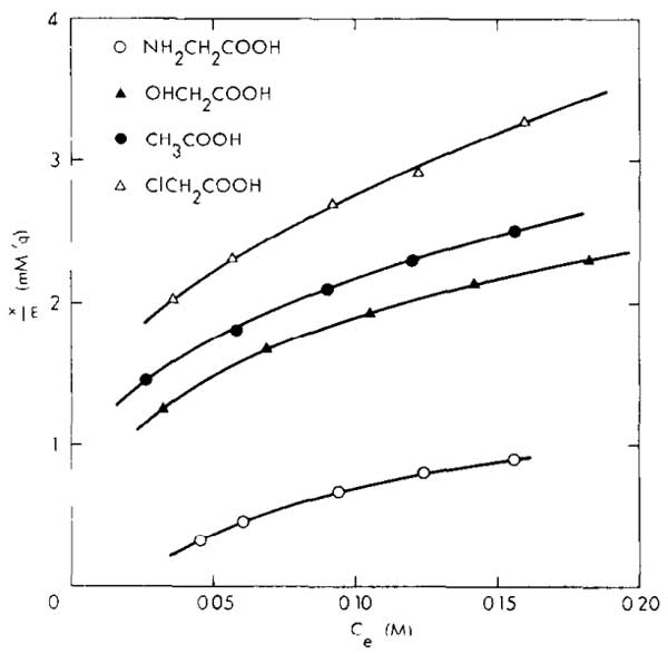 等溫線的比較表明,吸附通常以CICH,COOH>CHsCOOH>OHCH,COOH>NH,CHsCOOH的順序降低。圖1通過取代乙酸在碳原子上的吸附等溫線顯示了這一點(diǎn)。