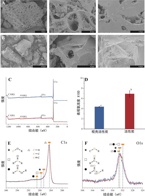 圖1:(A)欖殼活性炭和(B)活性炭在一系列放大倍數(shù)下的SEM顯微照片,(C)XPS調(diào)查掃描,(D)表觀氧元素濃度,(E)碳信號,(F)氧濃度之間的顯著差異。