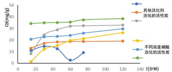 活性炭的吸附時(shí)間影響可從圖1看出,活性炭吸附分三步進(jìn)行:第一是在最初的30分鐘內(nèi),污染物的吸附量很快就被確定了,這可以用在吸附劑的外表面存在大量空置的結(jié)合位點(diǎn),這使得吸附劑易于吸附到該表面。第二在31分鐘后,吸附速率降低,過(guò)程緩慢。活性炭的其他位置達(dá)到飽和后,污染物顆粒將遷移到吸附劑內(nèi)部。由于易于接近,因此吸附過(guò)程緩慢:顆粒內(nèi)擴(kuò)散。第三從80分鐘開(kāi)始,我們觀察到一次接觸,活性炭已達(dá)到其最大容量。我們可以說(shuō)這些吸附劑的平衡時(shí)間是80分鐘。然而,磷酸活化的活性炭吸附量的演化曲線顯示,在最初的30分鐘內(nèi),污染物的吸附量顯著增加,此后,污染物的吸附量急劇下降,這將是一種產(chǎn)物解吸。這一現(xiàn)象在其他吸附劑中是不可見(jiàn)的,這可能意味著可用孔隙的數(shù)量和結(jié)合力隨著所用活化劑濃度的增加而增加,這一點(diǎn)還通過(guò)碘值和亞甲基藍(lán)的值進(jìn)行了驗(yàn)證。