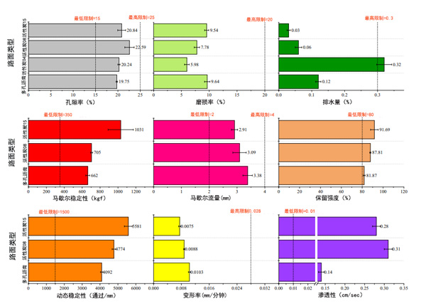 圖2:活性炭和多孔瀝青的調節(jié)性能(空隙,磨耗,排水,馬歇爾穩(wěn)定性,馬歇爾流量,保留強度,動態(tài)穩(wěn)定性,變形率和滲透性)的比較。