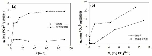 圖3:(a)磷酸鹽在活性炭和浸漬活性炭上的吸附動(dòng)力學(xué),以及(b)對(duì)磷酸鹽的吸附等溫線。