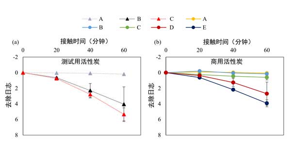 圖2:在不同的接觸時間(0、20、40和60分鐘),測試用(a)和活性炭(b)去除MS2。