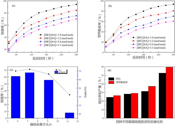 盡管碳水化合物衍生的化合物在加氫脫氧過程中對芳族化合物有影響,但是之前的一些熱解油升級的研究集中在加氫脫氧反應(yīng)中碳水化合物衍生的化合物和木質(zhì)素衍生的芳族化合物之間的相互作用。在這次研究中,用活性炭催化從酚級分(SA)產(chǎn)生的碳水化合物衍生物的(MF)的加氫脫氧的熱解油的效果進(jìn)行了研究(在圖3所示)。MF的存在對SA的轉(zhuǎn)化和鄰甲酚的收率產(chǎn)生了很大的影響。在不存在MF的情況下,SA的轉(zhuǎn)化率為99%,持續(xù)180分鐘,相應(yīng)的鄰甲酚產(chǎn)率為97%。隨著反應(yīng)物中MF比例的增加,SA轉(zhuǎn)化率和鄰甲酚產(chǎn)率均顯著降低。當(dāng)(MF)/(SA)值為1.00(mol / mol)時,SA的轉(zhuǎn)化率和鄰甲酚的收率分別從99%和97%急劇下降至70%和60%,這表明通過在反應(yīng)物中存在MF,抑制了SA的反應(yīng)性。